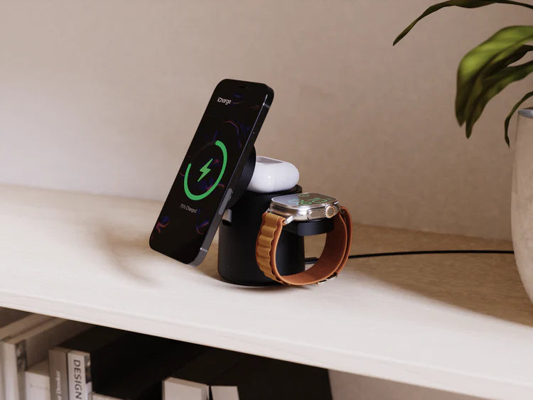 This 3-in-1 charger fits perfectly on your desk or in your bag. It's small enough to keep things tidy and portable enough to take with you wherever you go, making charging easy at home, in the office, or on the move.