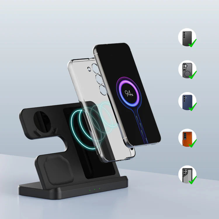 It's designed to work seamlessly with all phone cases. Just place your phone on the dock and power up effortlessly!